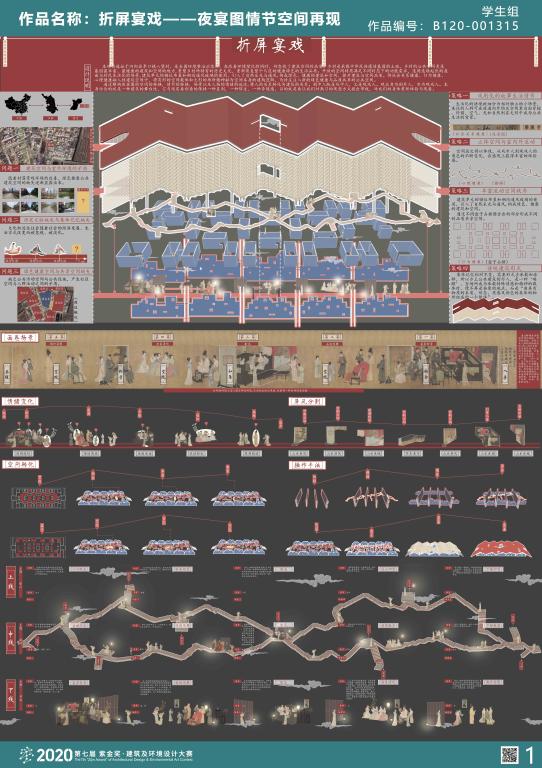 初次见到建筑工程学院周俊杰,他身上的艺术气息便吸引了我。不止是长相清秀,谈吐中总是提及的传统艺术、文化力量、建筑温度打破了我对于“工科男”的刻板印象。正是他这理科思维与人文情怀的完美结合,造就了“折屏宴戏——夜宴图情节空间再现”这一佳作,一举拿下第七届“紫金奖·建筑及环境设计大赛(2020)”学生组一等奖和决赛铜奖。